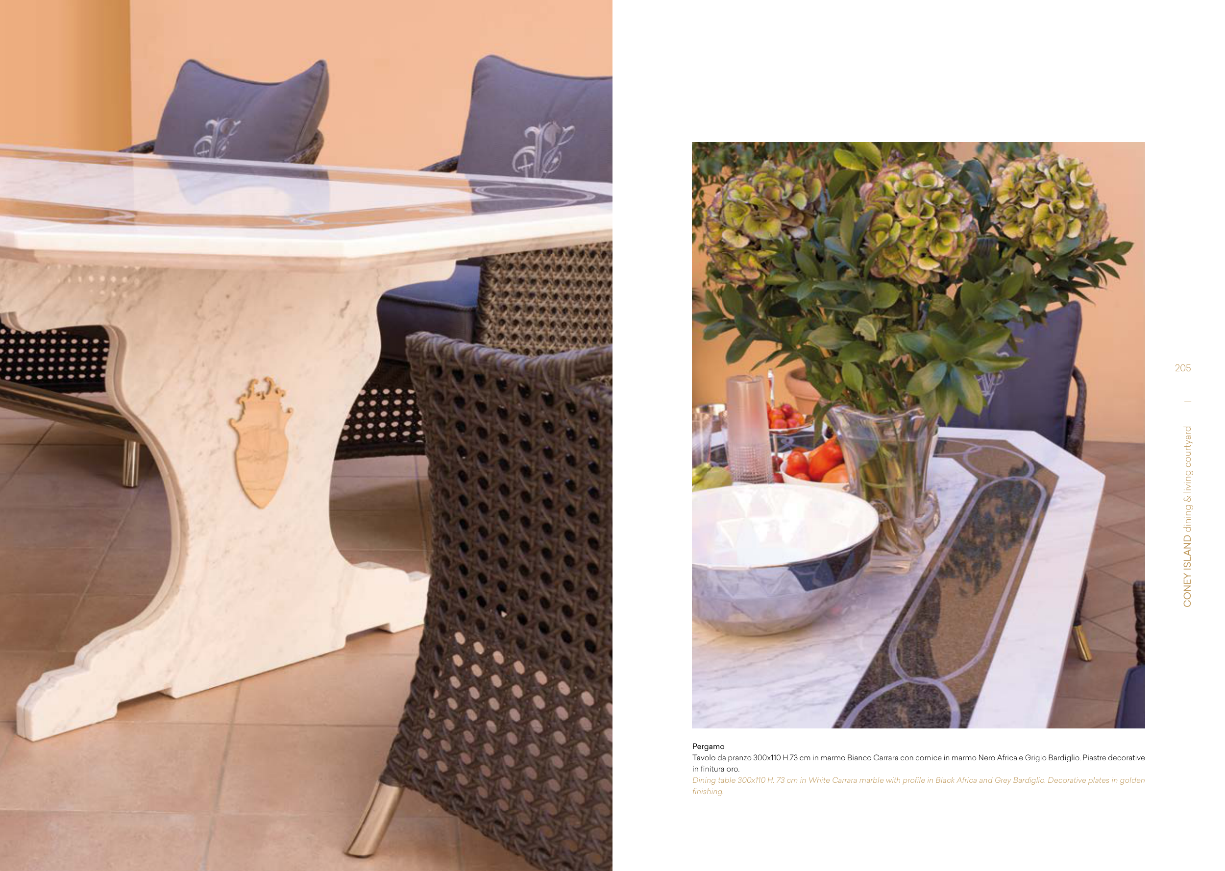 Dining table 300x110 H. 73 cm in White Carrara marble with profile in Black Africa and Grey Bardiglio. Decorative plates in golden