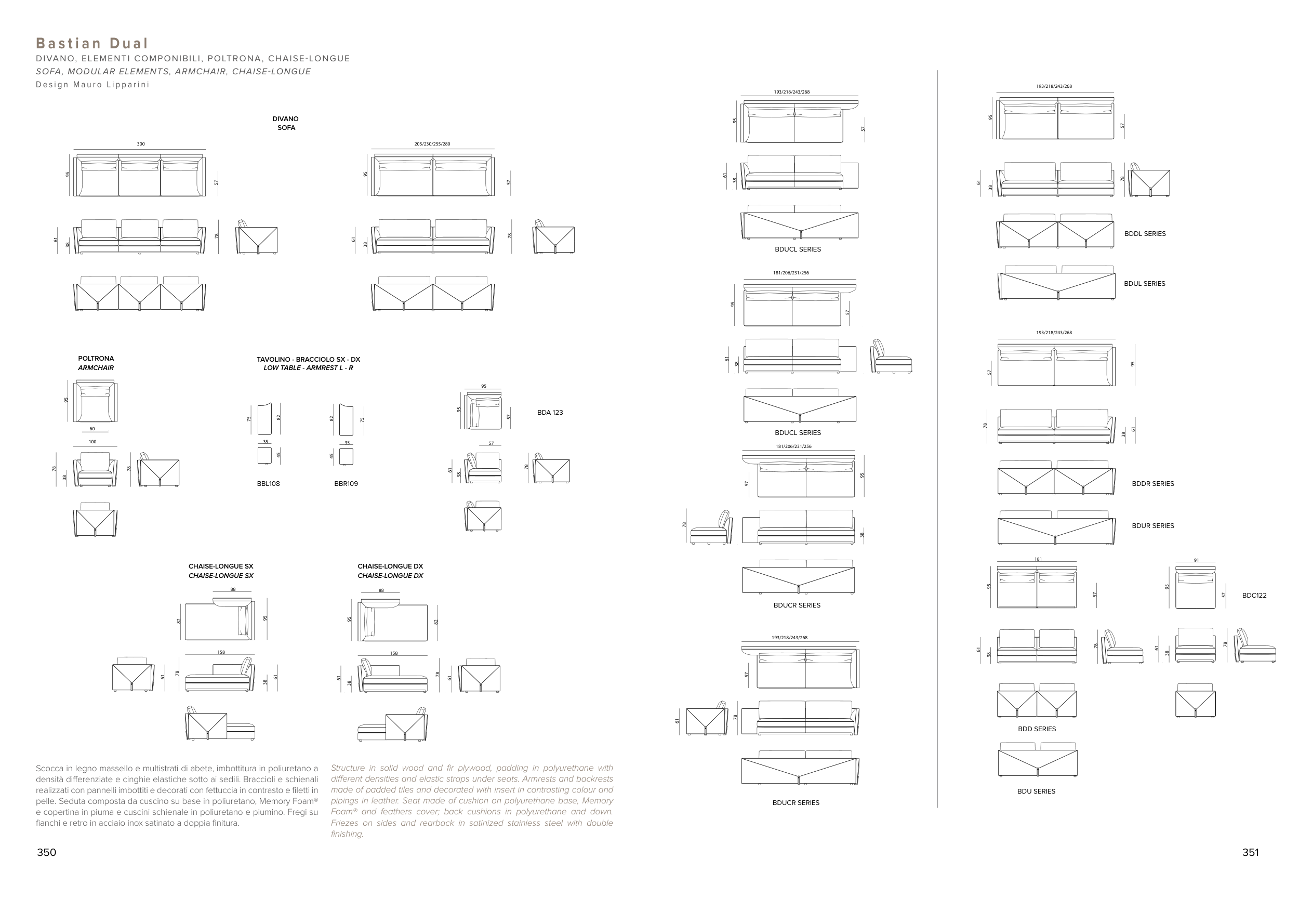 Foam® and feathers cover; back cushions in polyurethane and down.