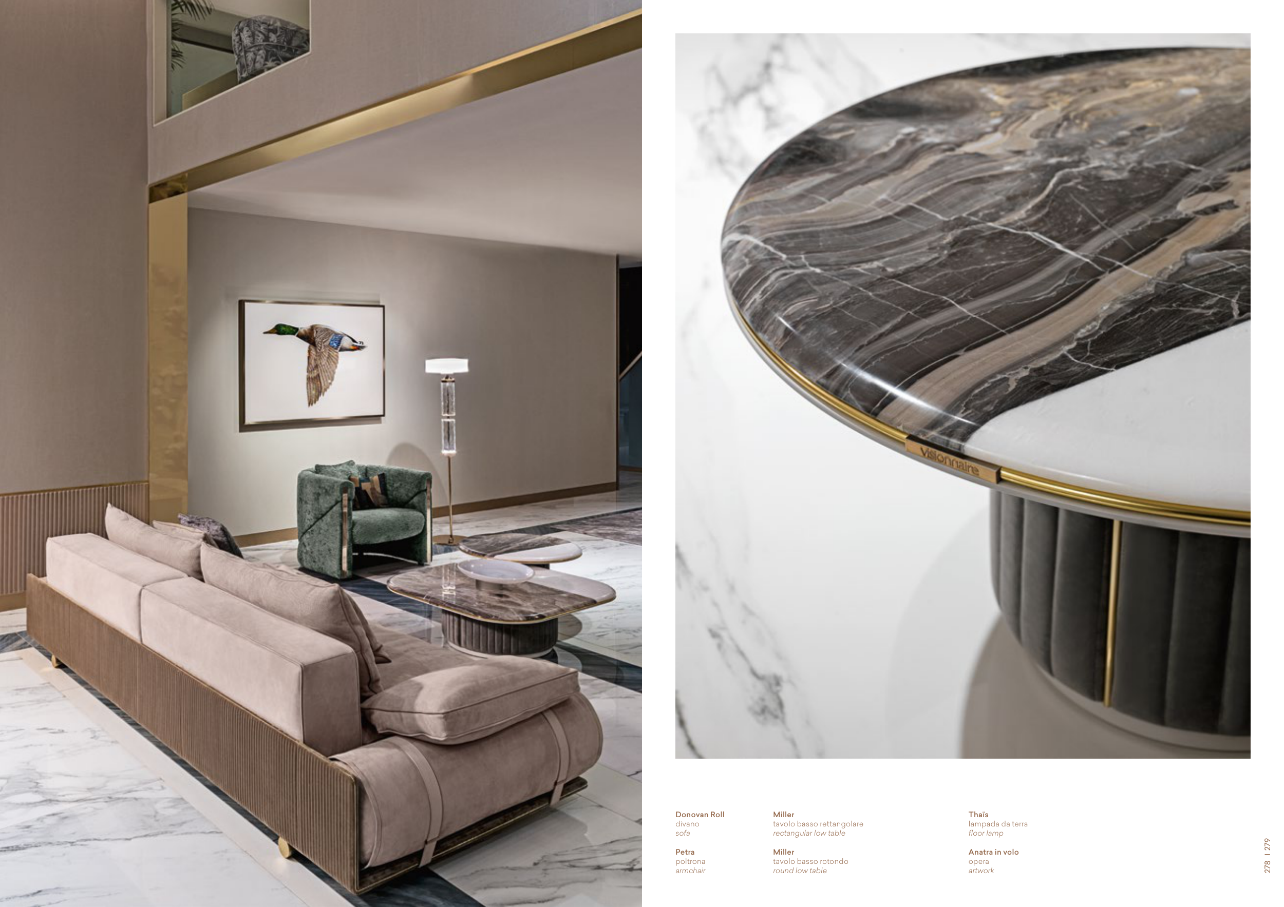 Donovan Roll divano sofa Petra poltrona armchair Miller tavolo basso rettangolare rectangular low table Miller tavolo basso rotondo round low table Thaïs lampada da terra floor lamp Anatra in volo opera artwork 279 278