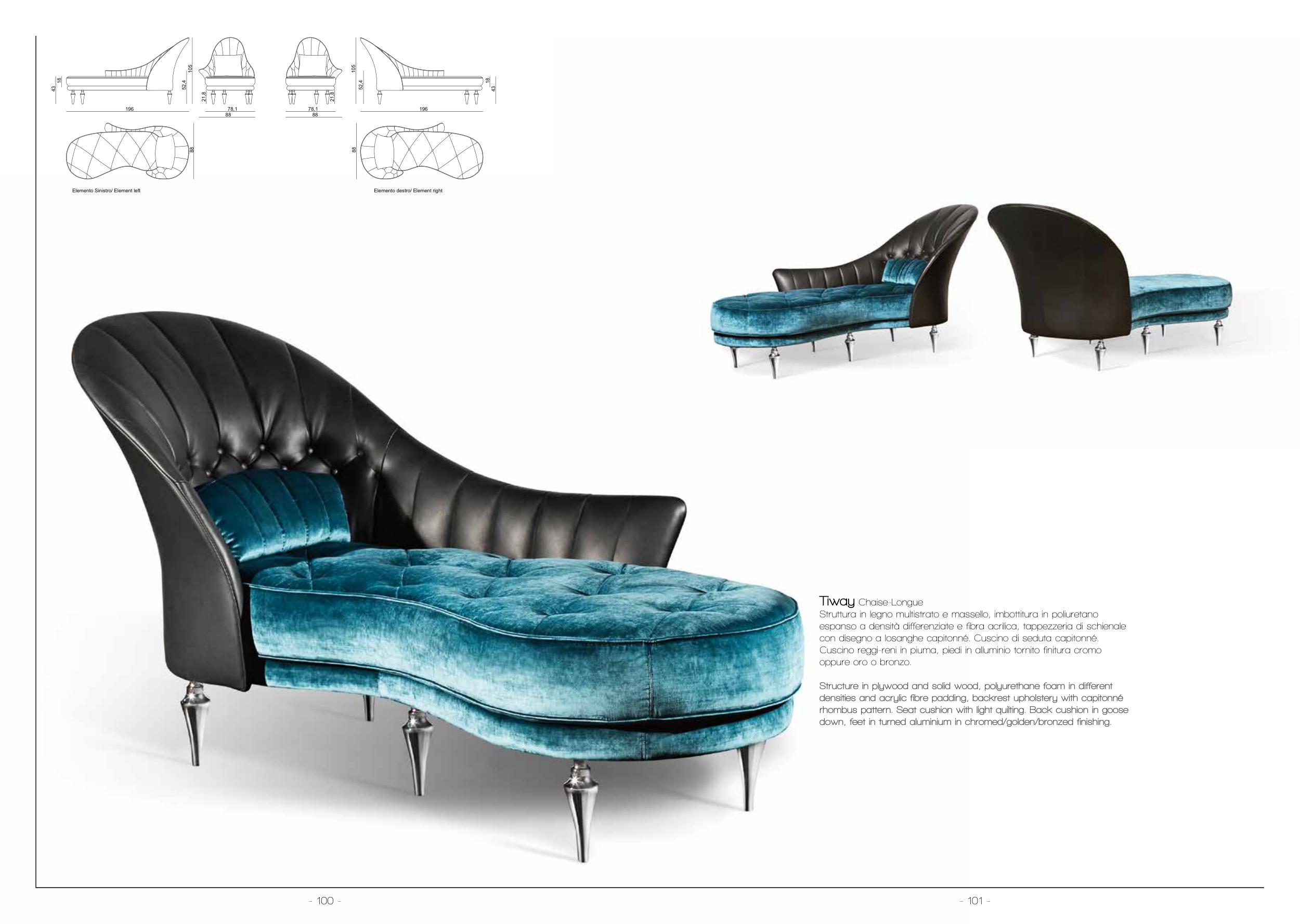 down, feet in turned aluminium in chromed/golden/bronzed finishing.