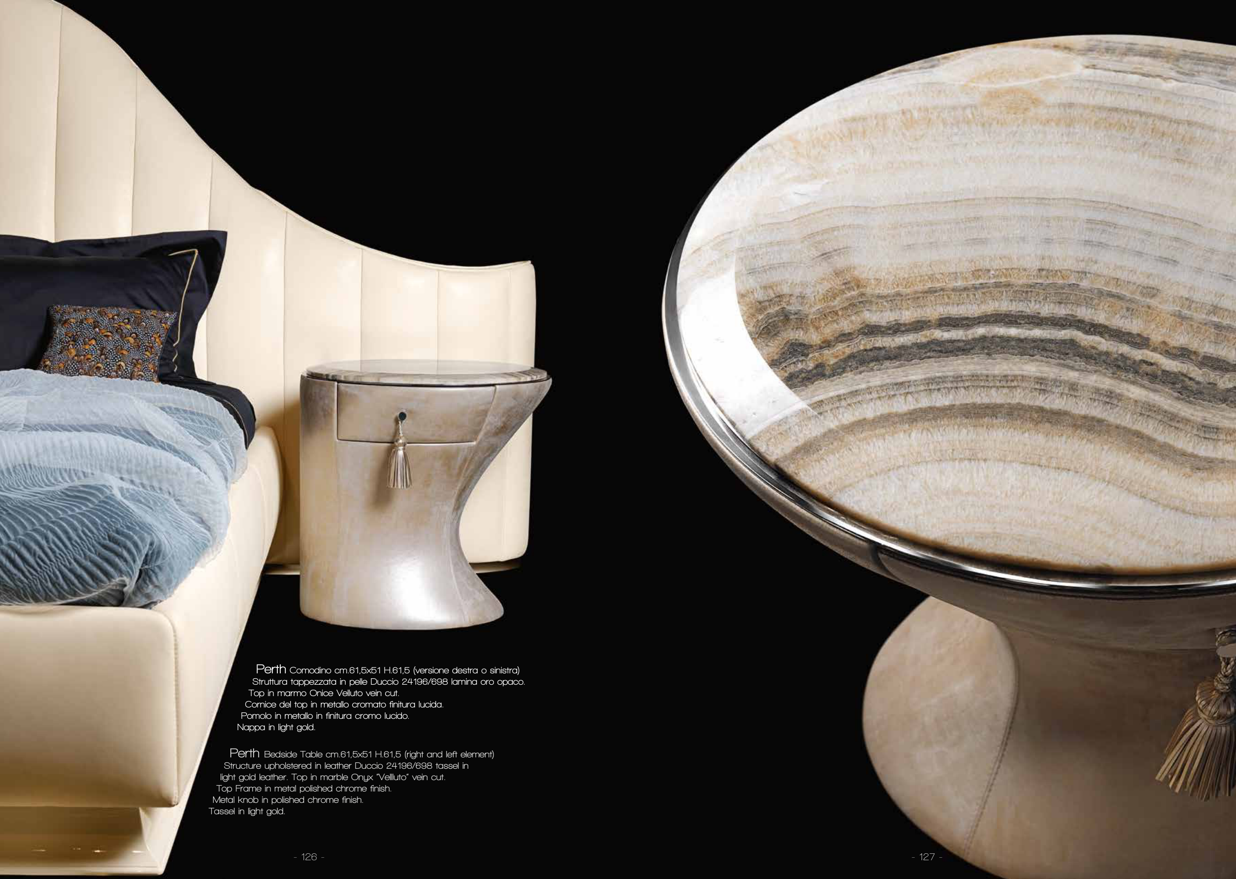 light gold leather. Top in marble Onyx “Vellluto” vein cut.