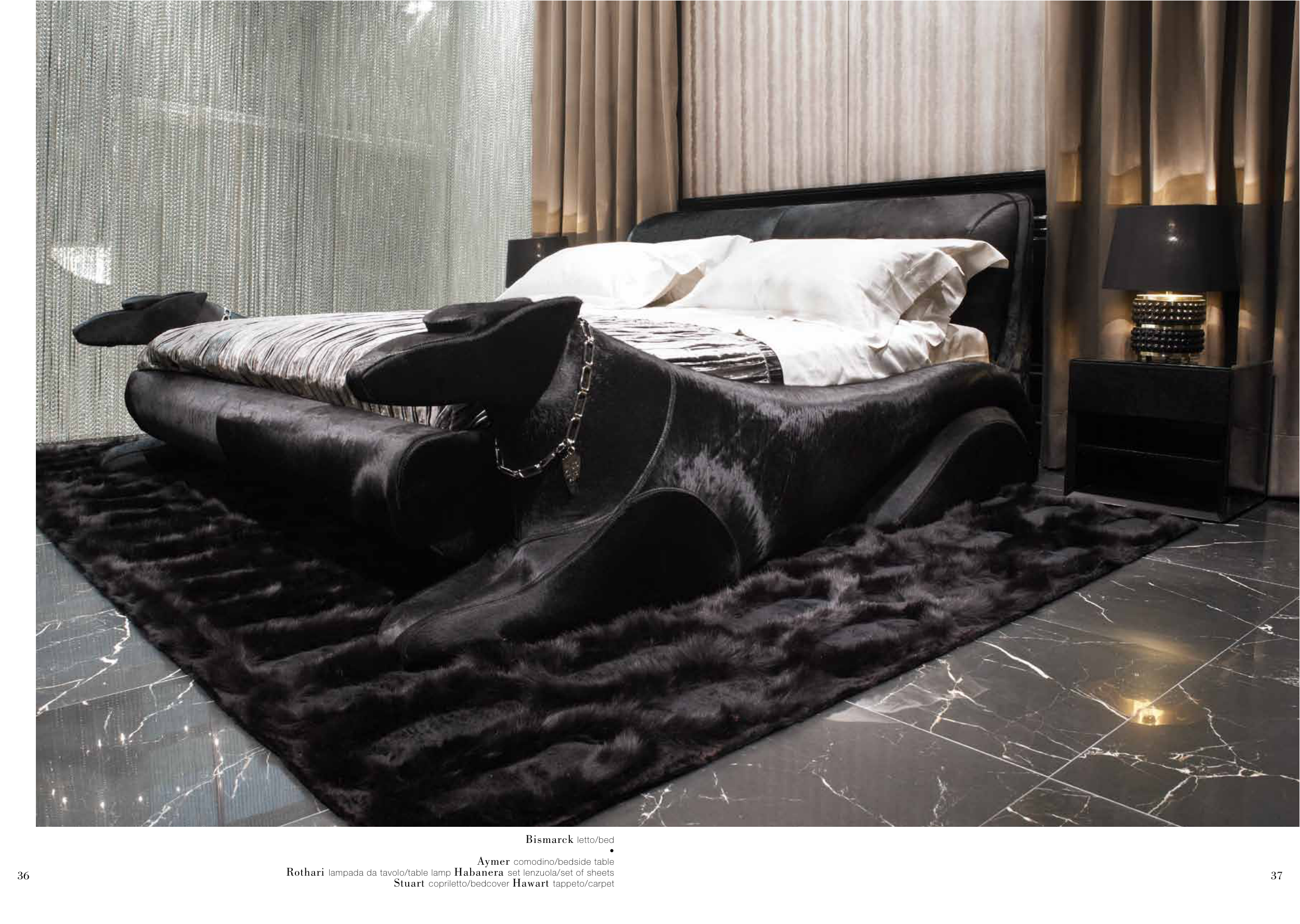 Bismarck letto/bed • Aymer comodino/bedside table Rothari lampada da tavolo/table lamp Habanera set lenzuola/set of sheets Stuart copriletto/bedcover Hawart tappeto/carpet 36 37