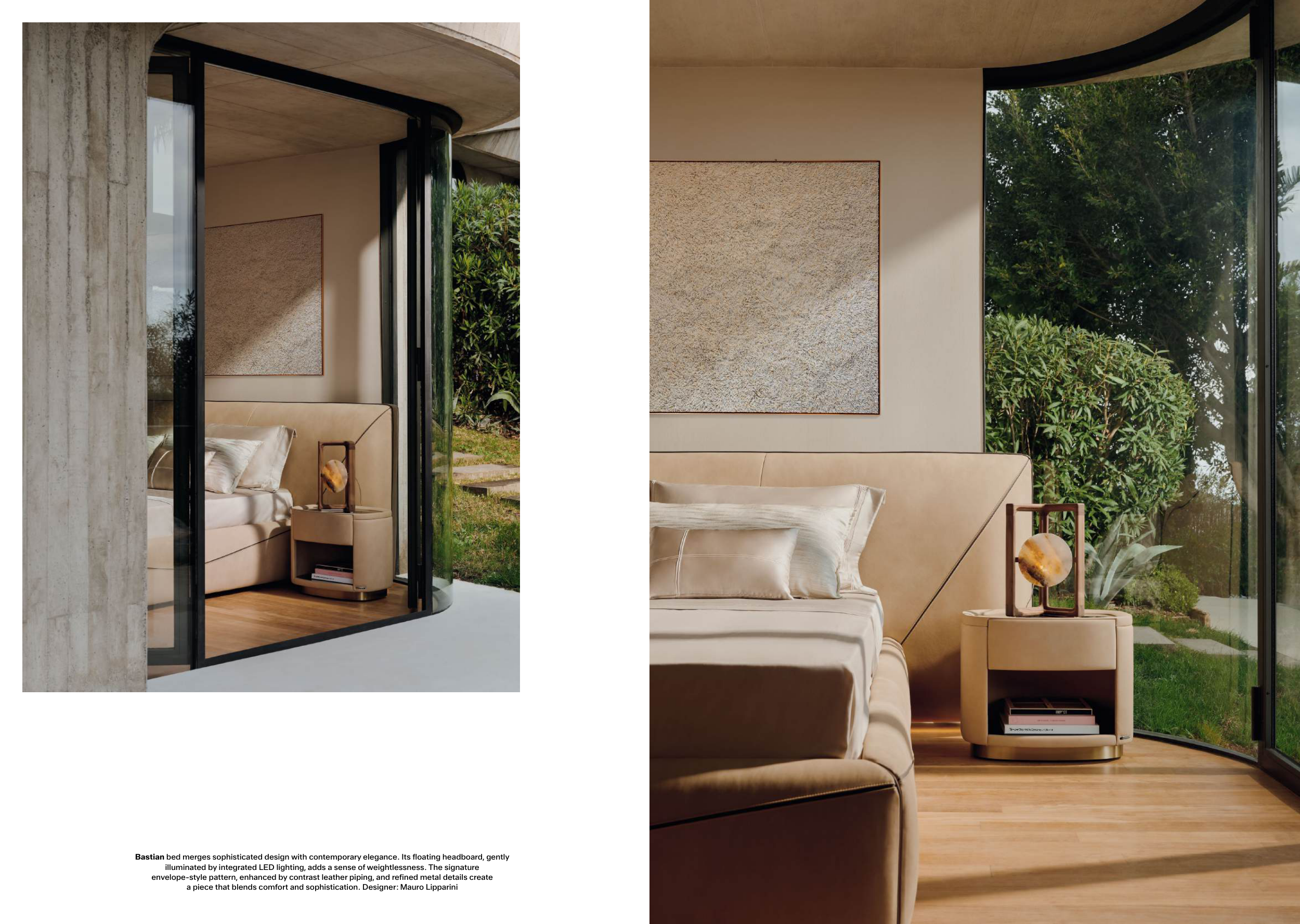 Bastian bed merges sophisticated design with contemporary elegance. Its floating headboard, gently