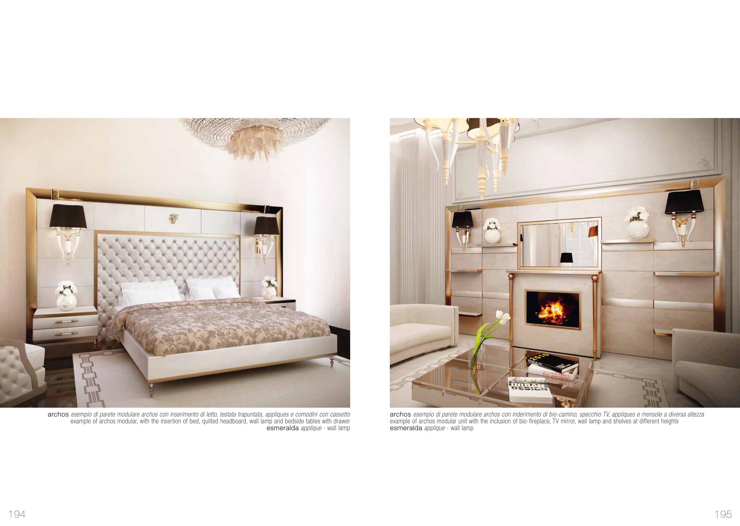 example of archos modular, with the insertion of bed, quilted headboard, wall lamp and bedside tables with drawer