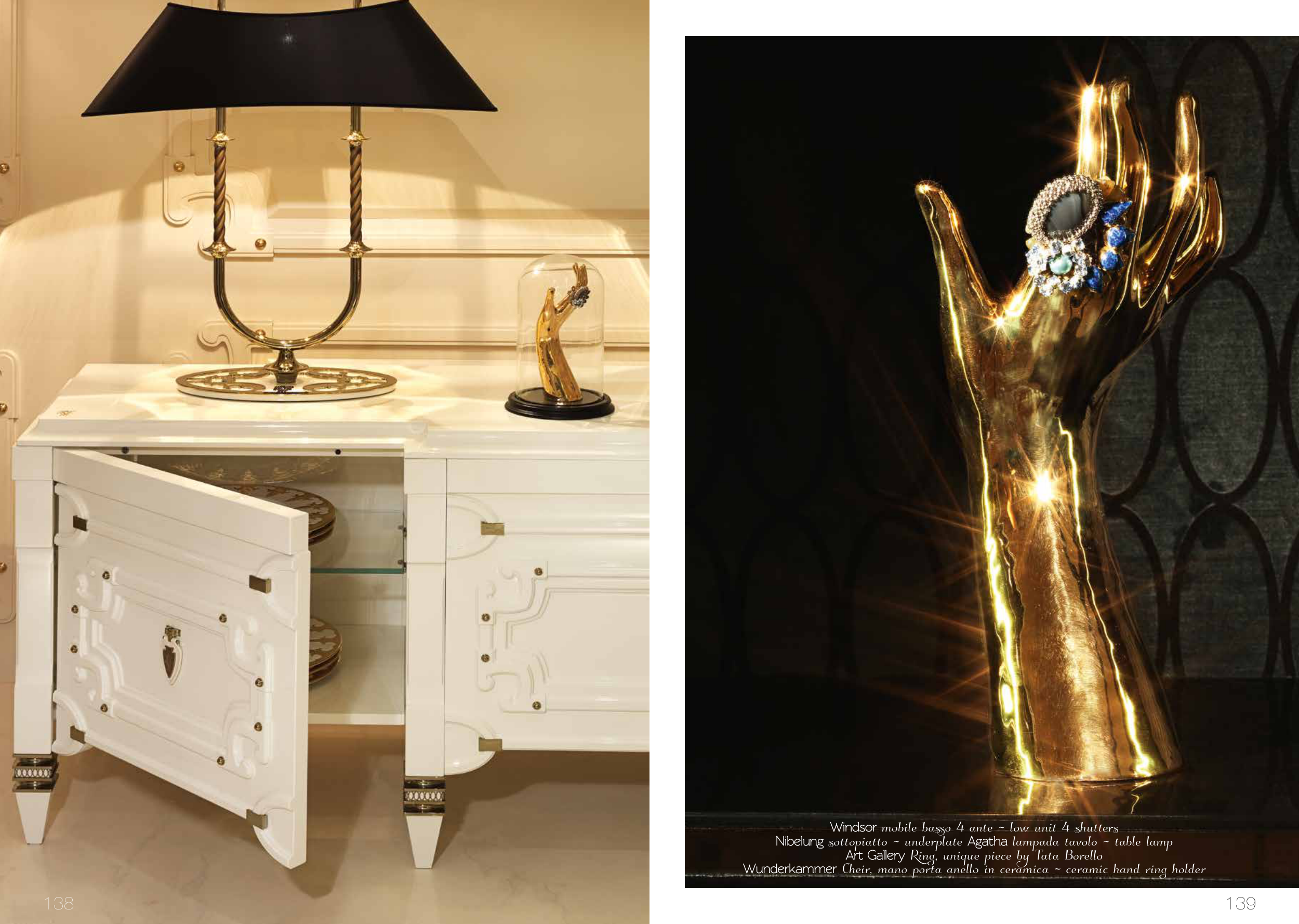 Windsor mobile basso 4 ante ~ low unit 4 shutters Nibelung sottopiatto ~ underplate Agatha lampada tavolo ~ table lamp Art Gallery Ring, unique piece by Tata Borello Wunderkammer Cheir, mano porta anello in ceramica ~ ceramic hand ring holder 139 138
