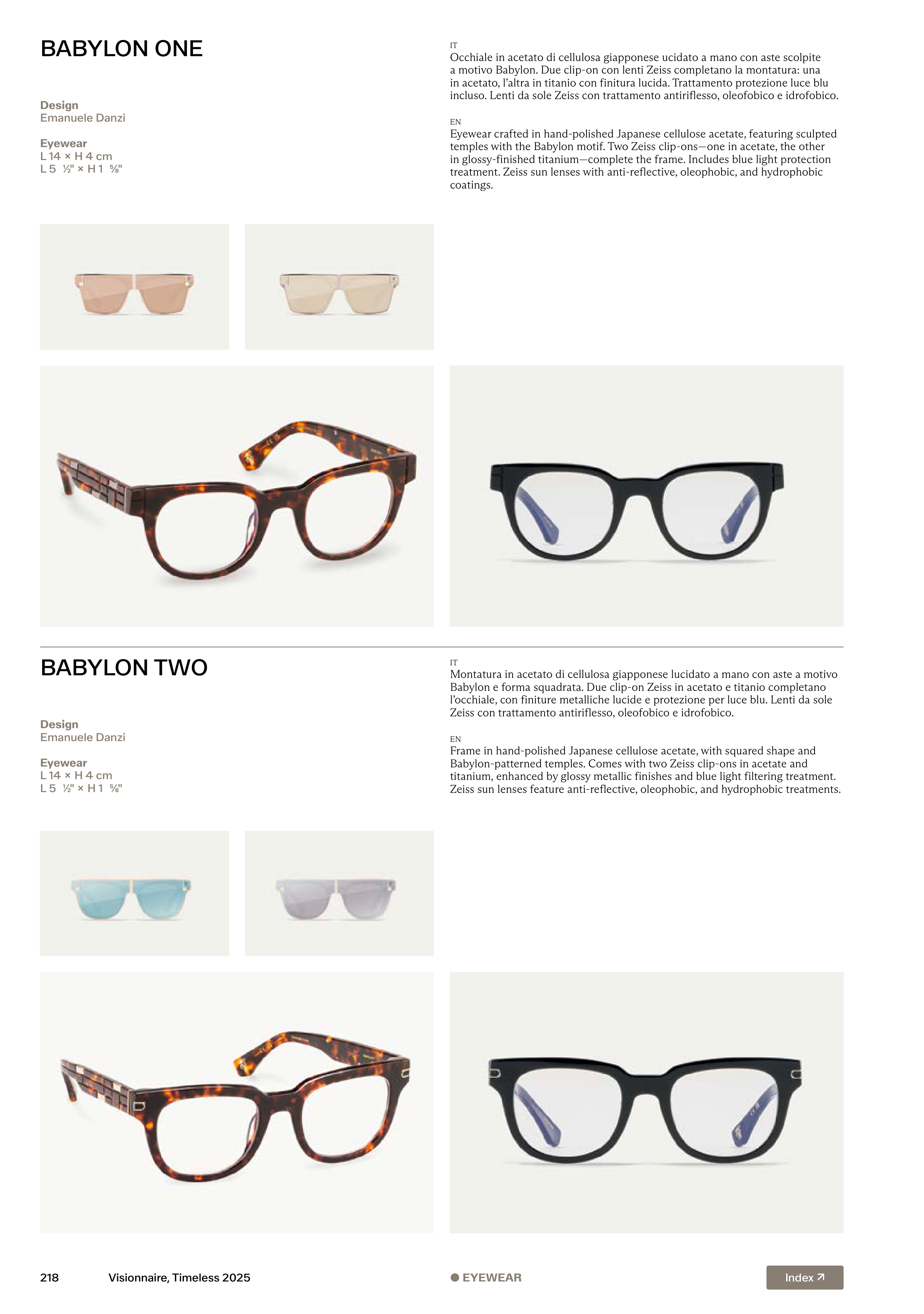 temples with the Babylon motif. Two Zeiss clip-ons—one in acetate, the other