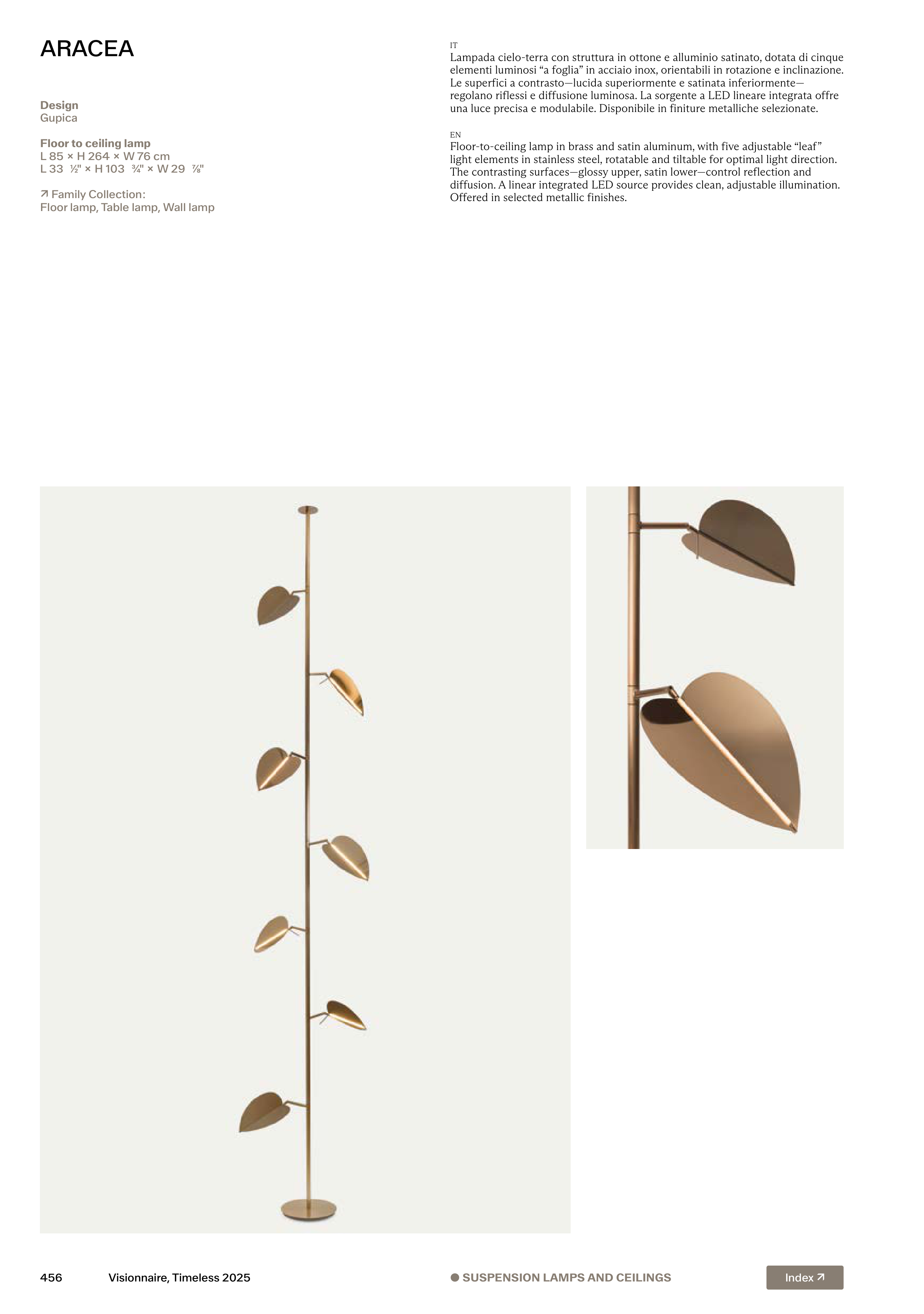 Floor-to-ceiling lamp in brass and satin aluminum, with five adjustable “leaf”