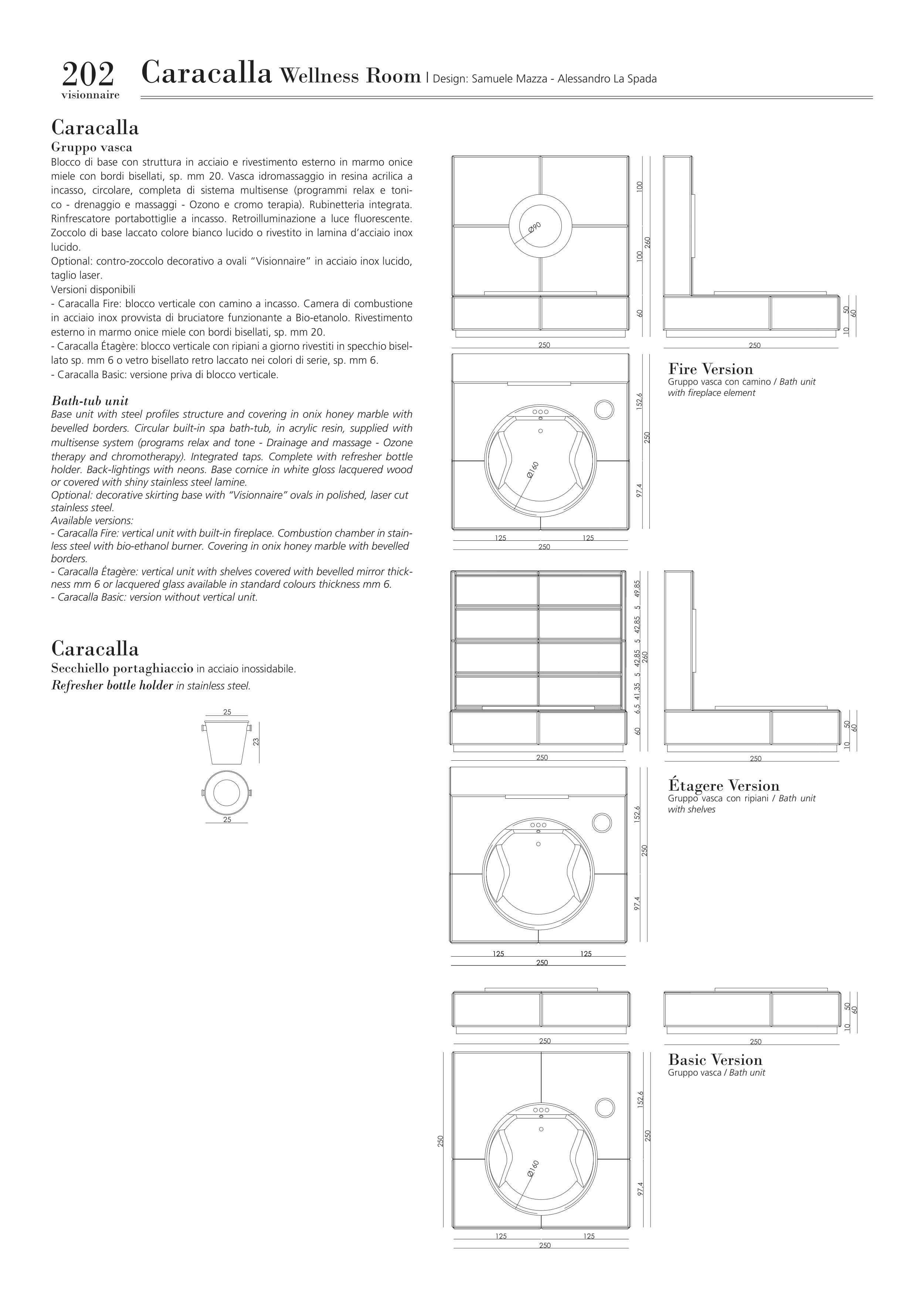 - Caracalla Fire: vertical unit with built-in fireplace. Combustion chamber in stain-