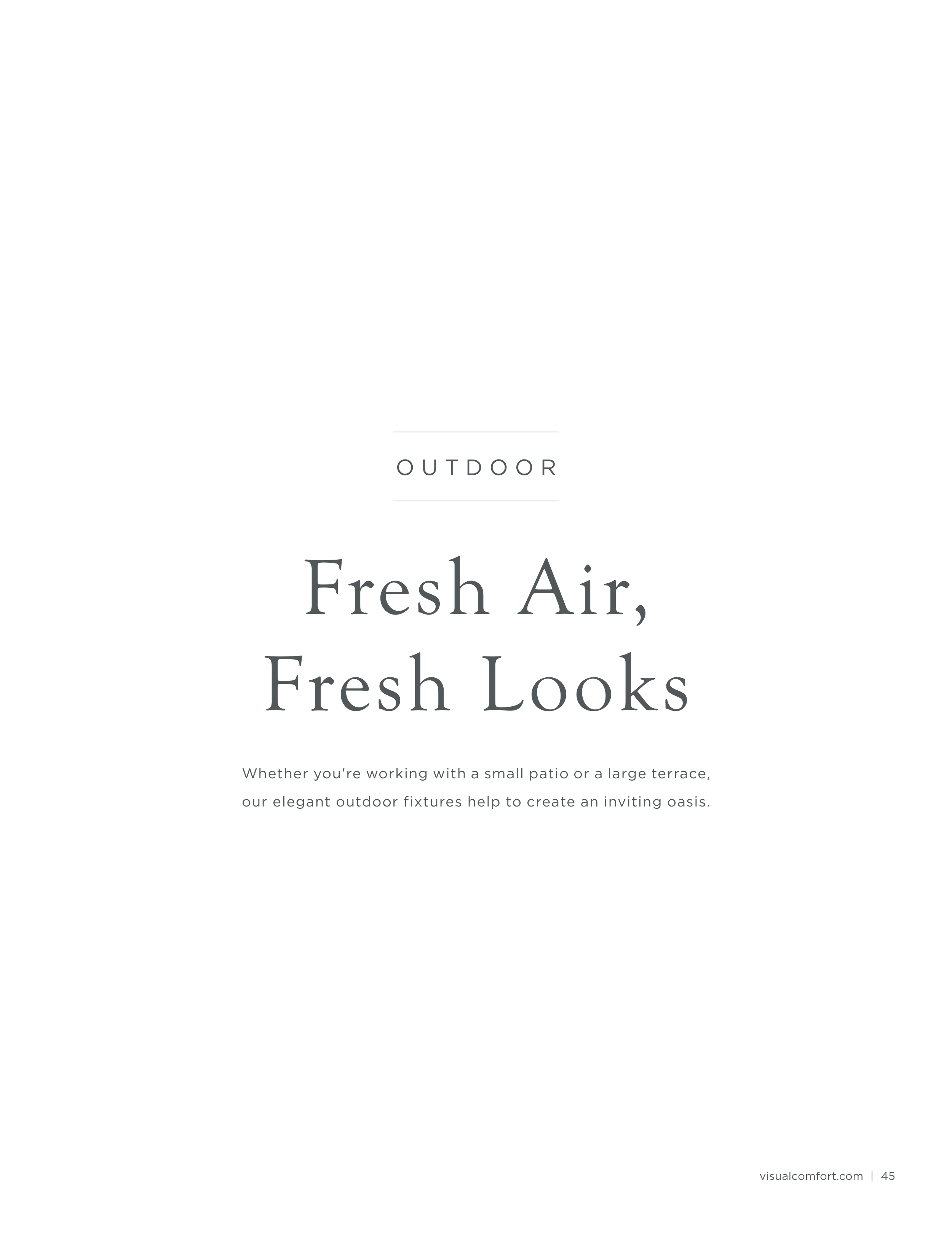 visualcomfort.com | 45 Fresh Air, Fresh Looks Whether you're working with a small patio or a large terrace, our elegant outdoor fixtures help to create an inviting oasis. O U T D O O R