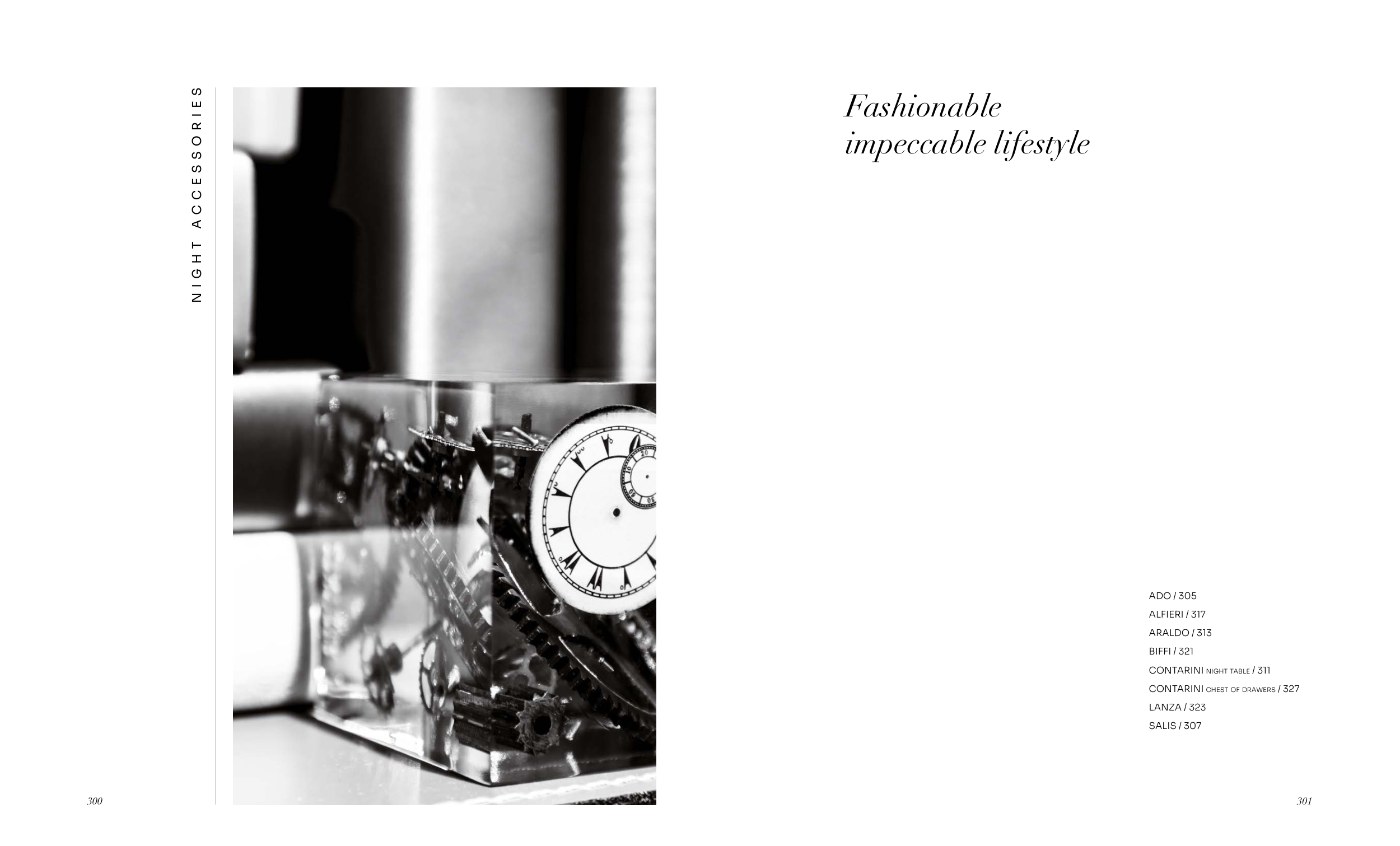 300 301 Fashionable impeccable lifestyle ADO / 305 ALFIERI / 317 ARALDO / 313 BIFFI / 321 CONTARINI night table / 311 CONTARINI chest of drawers / 327 LANZA / 323 SALIS / 307 N I G H T A C C E S S O R I E S