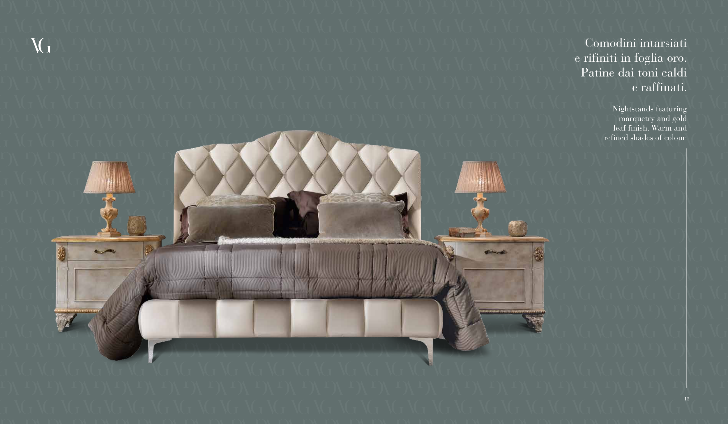Comodini intarsiati e rifiniti in foglia oro. Patine dai toni caldi e raffinati. Nightstands featuring marquetry and gold leaf finish. Warm and refined shades of colour. 13