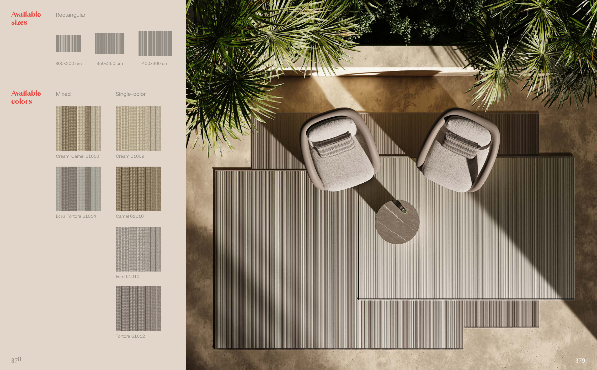 378 378 Cream 61009 Cream_Camel 61010 Camel 61010 Ecru_Tortora 61014 Ecru 61011 Tortora 61012 Single-color Mixed Rectangular 300×200 cm 350×250 cm 400×300 cm Available Available sizes sizes Available Available colors colors 379
