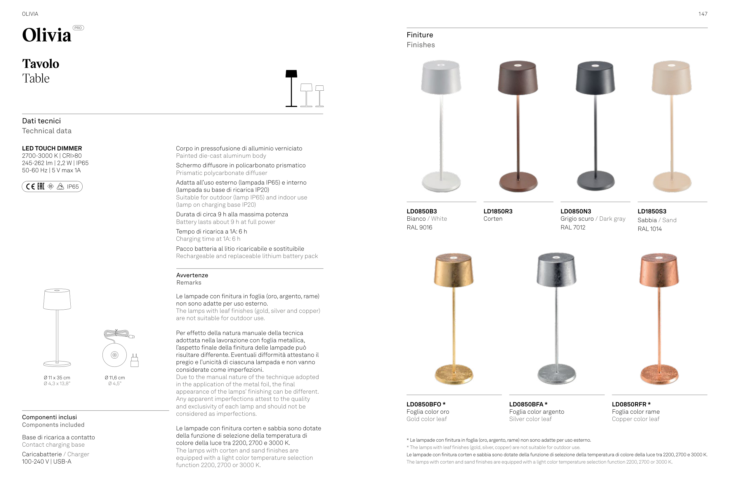 * Le lampade con finitura in foglia (oro, argento, rame) non sono adatte per uso esterno.