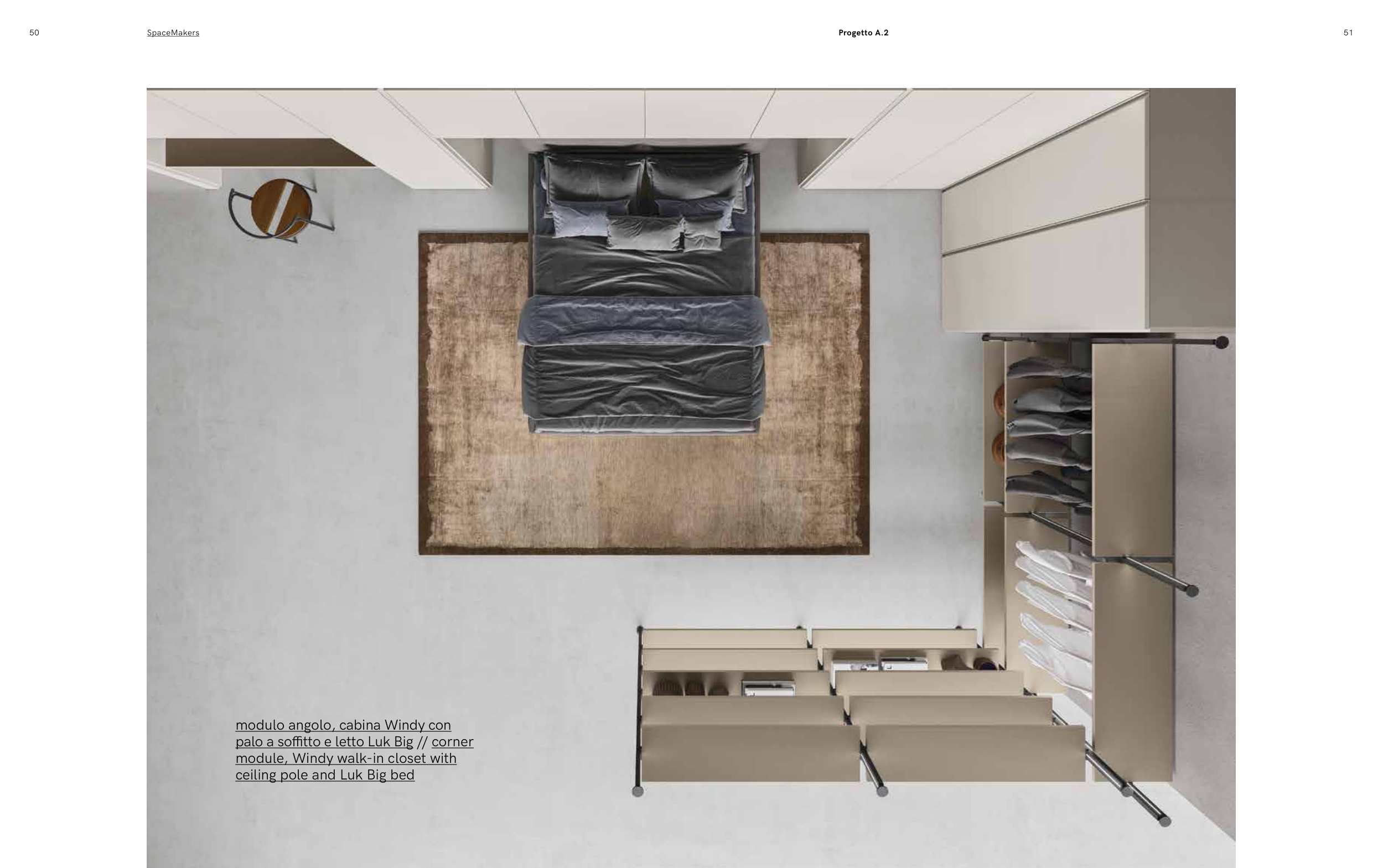 50 SpaceMakers 51 modulo angolo, cabina Windy con palo a soffitto e letto Luk Big // corner module, Windy walk-in closet with ceiling pole and Luk Big bed Progetto A.2