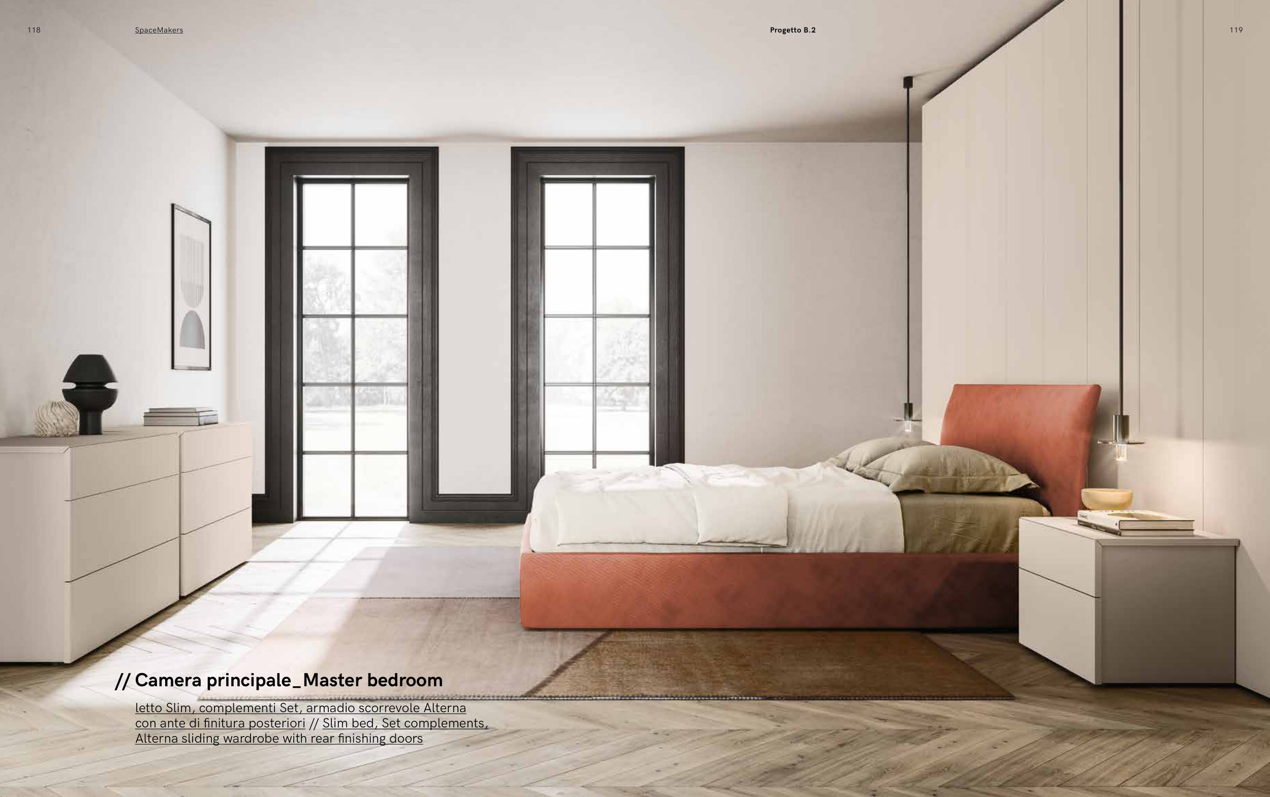 118 SpaceMakers 119 Progetto B.2 letto Slim, complementi Set, armadio scorrevole Alterna con ante di finitura posteriori // Slim bed, Set complements, Alterna sliding wardrobe with rear finishing doors // Camera principale_Master bedroom