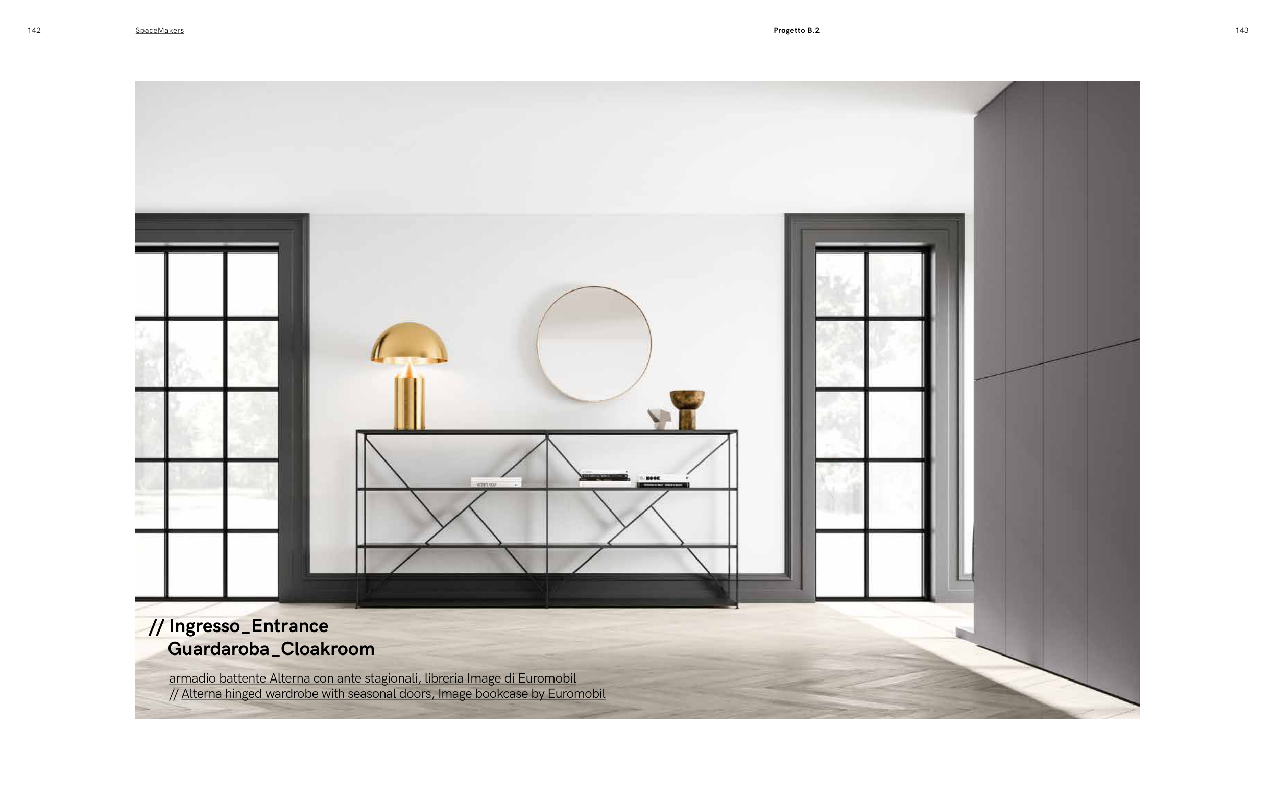 142 SpaceMakers 143 // Ingresso_Entrance Guardaroba_Cloakroom armadio battente Alterna con ante stagionali, libreria Image di Euromobil // Alterna hinged wardrobe with seasonal doors, Image bookcase by Euromobil Progetto B.2