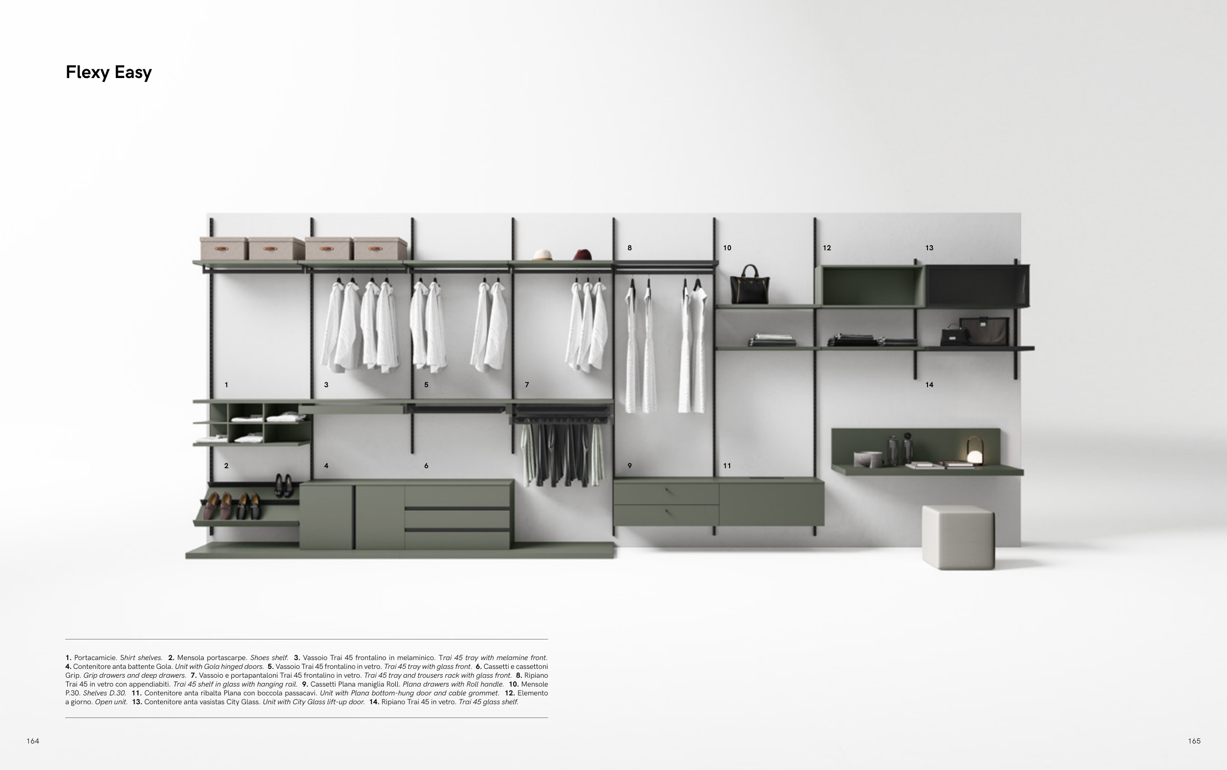 a giorno. Open unit. 13. Contenitore anta vasistas City Glass. Unit with City Glass lift-up door. 14. Ripiano Trai 45 in vetro. Trai 45 glass shelf.