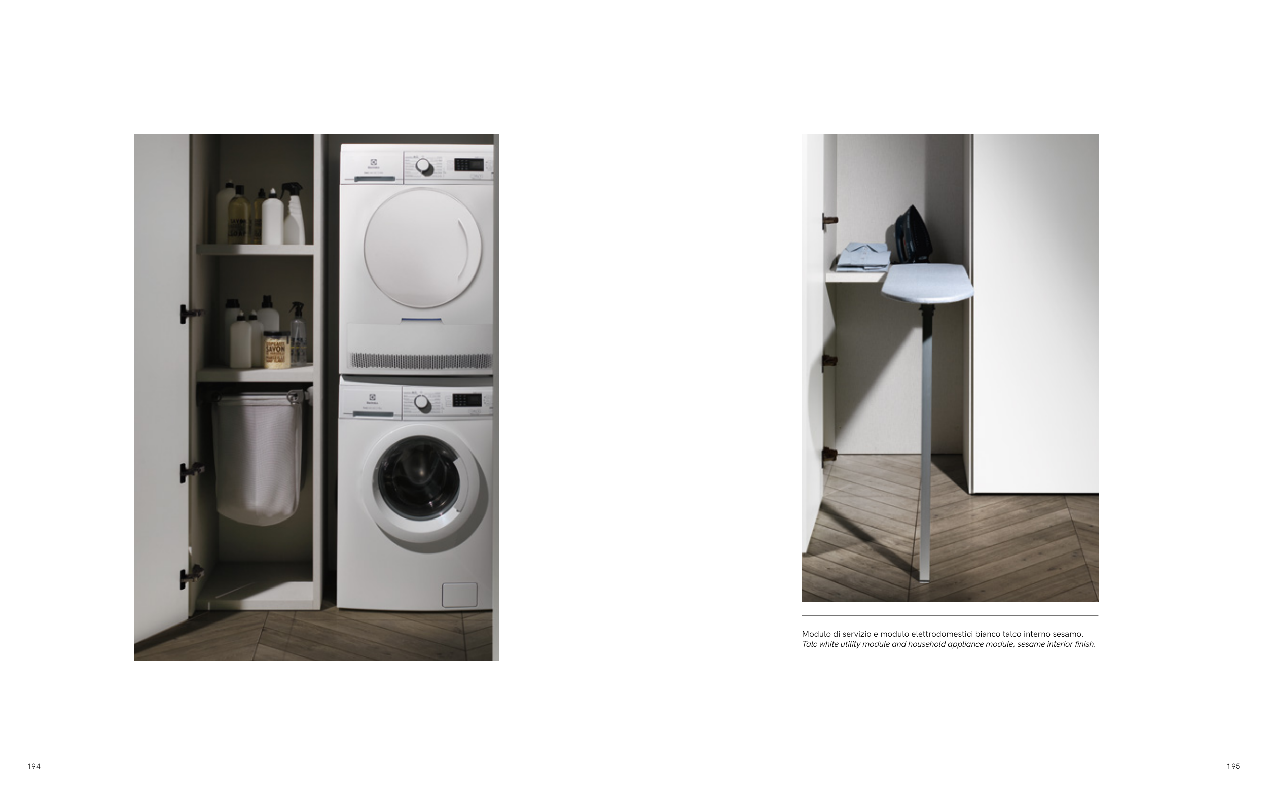 194 195 Modulo di servizio e modulo elettrodomestici bianco talco interno sesamo. Talc white utility module and household appliance module, sesame interior finish.