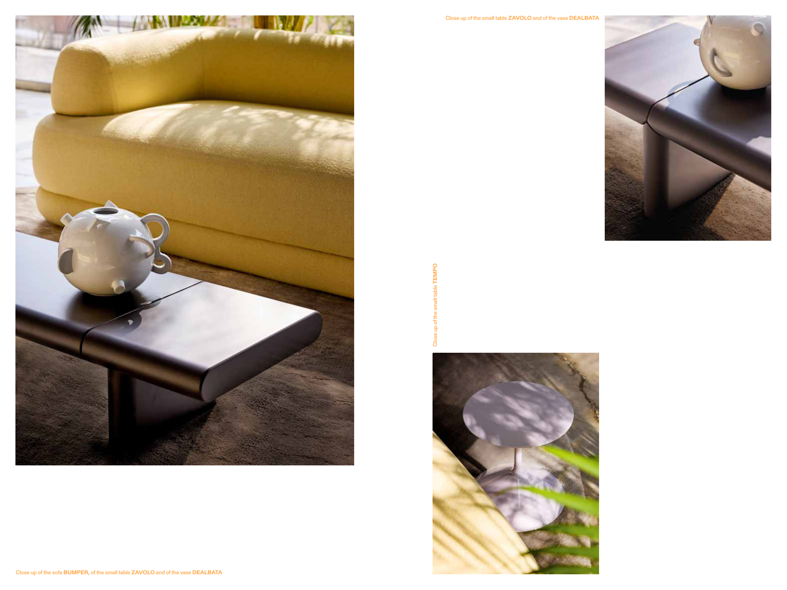 Close up of the sofa BUMPER, of the small table ZAVOLO and of the vase DEALBATA Close up of the small table TEMPO Close up of the small table ZAVOLO and of the vase DEALBATA