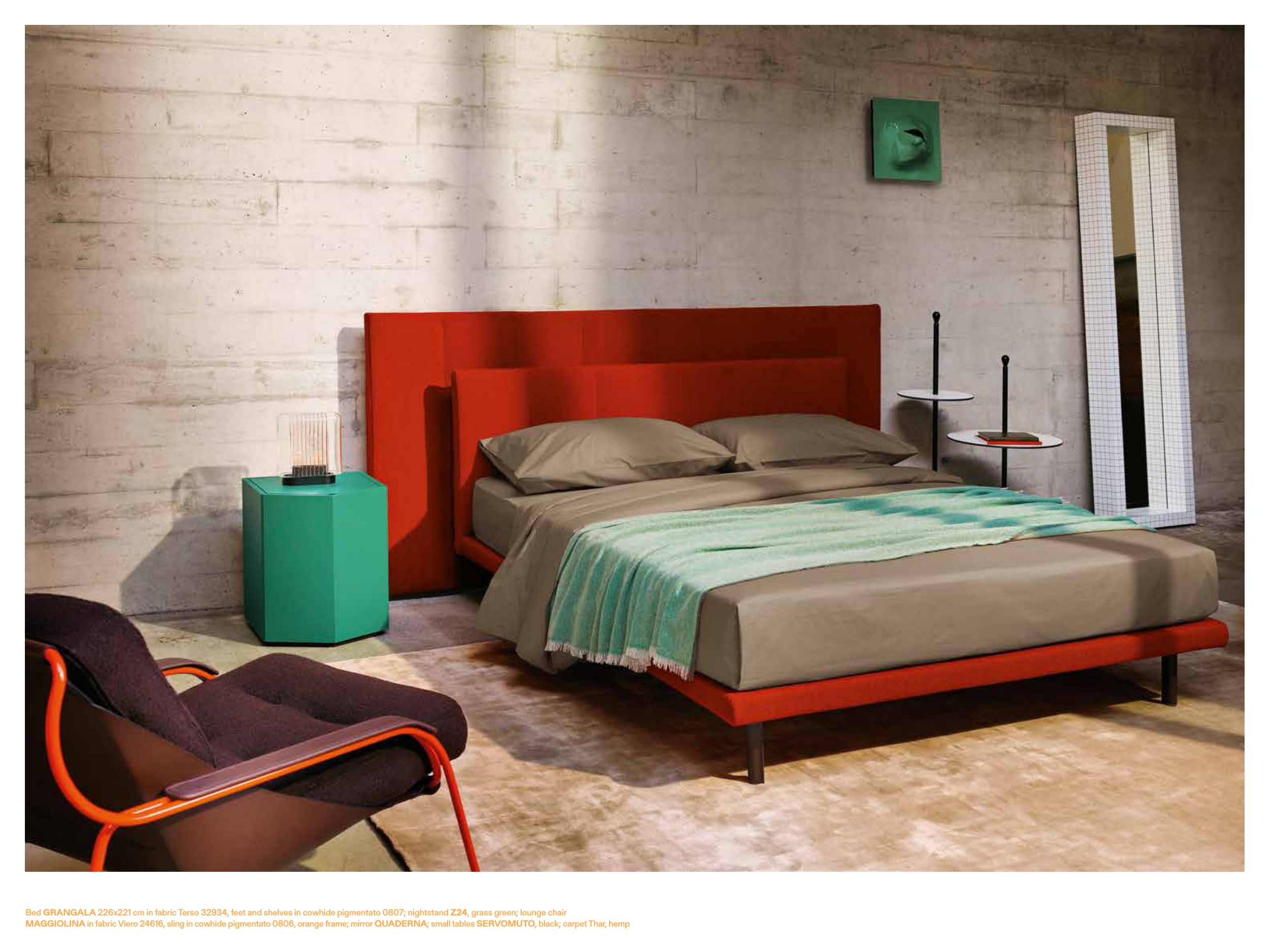 Bed GRANGALA 226x221 cm in fabric Terso 32934, feet and shelves in cowhide pigmentato 0807; nightstand Z24, grass green; lounge chair