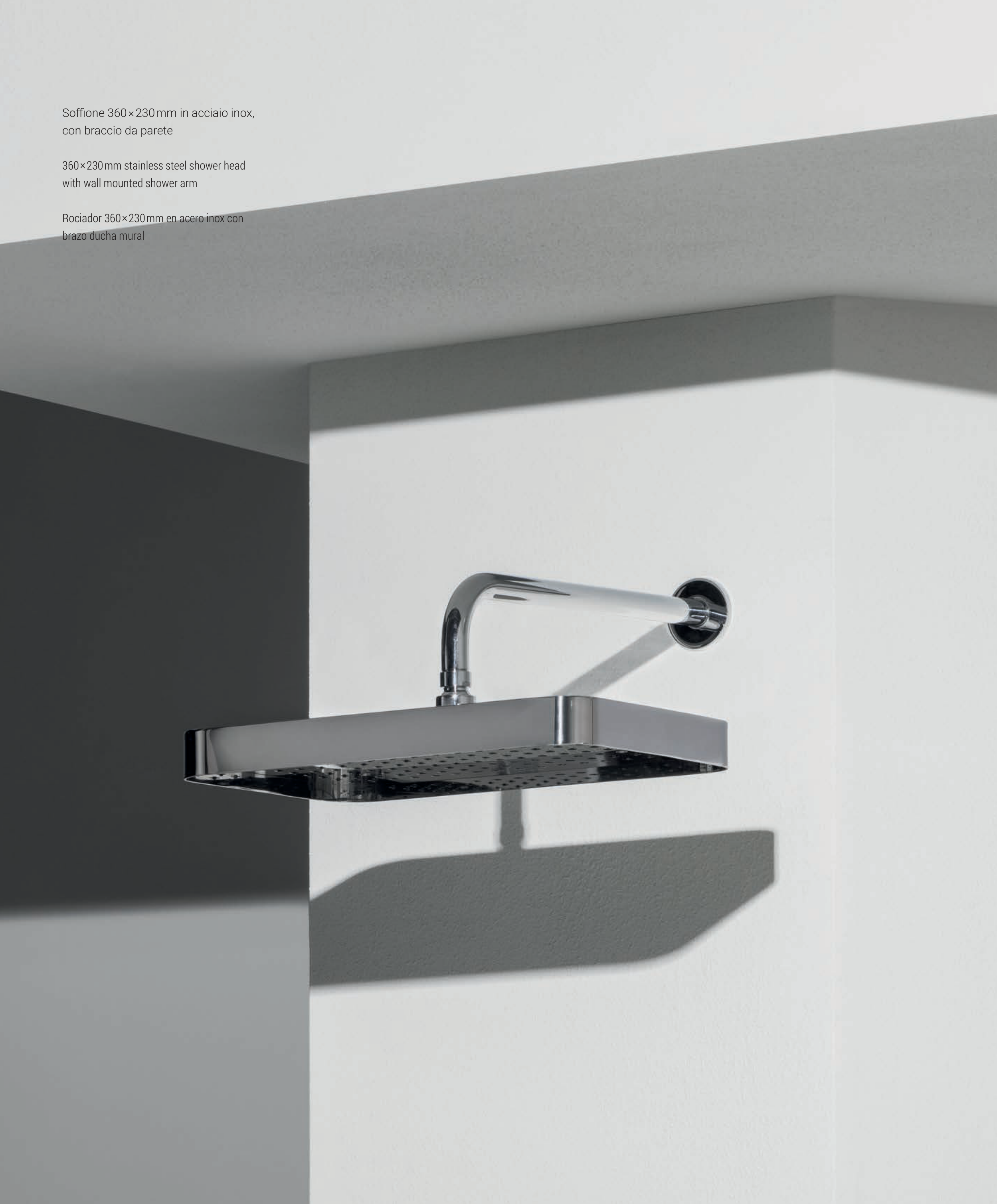 Soffione 360 × 230 mm in acciaio inox, con braccio da parete 360 × 230 mm stainless steel shower head with wall mounted shower arm Rociador 360 × 230 mm en acero inox con brazo ducha mural